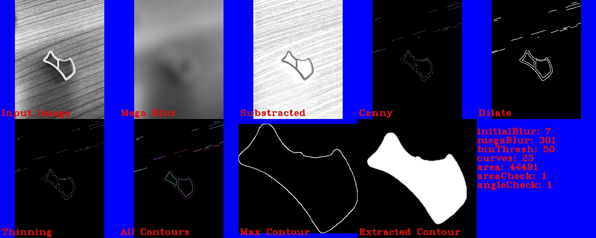 Die Bilderkennung der Dichtungen erfolgt konturbasiert. Das Foto des Dichtungsquerschnitts wird zunächst mit einem starken Unschärfefilter überzogen (blurring). Anschließend wird das Eingabebild von dem unscharfen Bild subtrahiert. Auf dieses subtrahierte Ergebnis wird ein Canny Filter gelegt, der für Kantenextraktion sorgt. Falls Lücken entstehen – also Kanten nicht durchgehend sind – werden sie durch einen Dilate-Algorithmus vervollständigt, um fehlende Pixel automatisch zu ergänzen. In diesem Prozess entstehen besonders dicke Kanten, die über einen Thinning-Algorithmus wieder schmaler gemacht werden. Als Resultat entsteht ein Konturbild ohne Lücken. Nun hat ein Algorithmus zur Konturerkennung die Aufgabe, sämtliche Kanten pixelgenau zu überprüfen. Die Herausforderung dabei ist, Störsignale herauszufiltern: Es gilt die richtige und größte Kontur zu identifizieren.