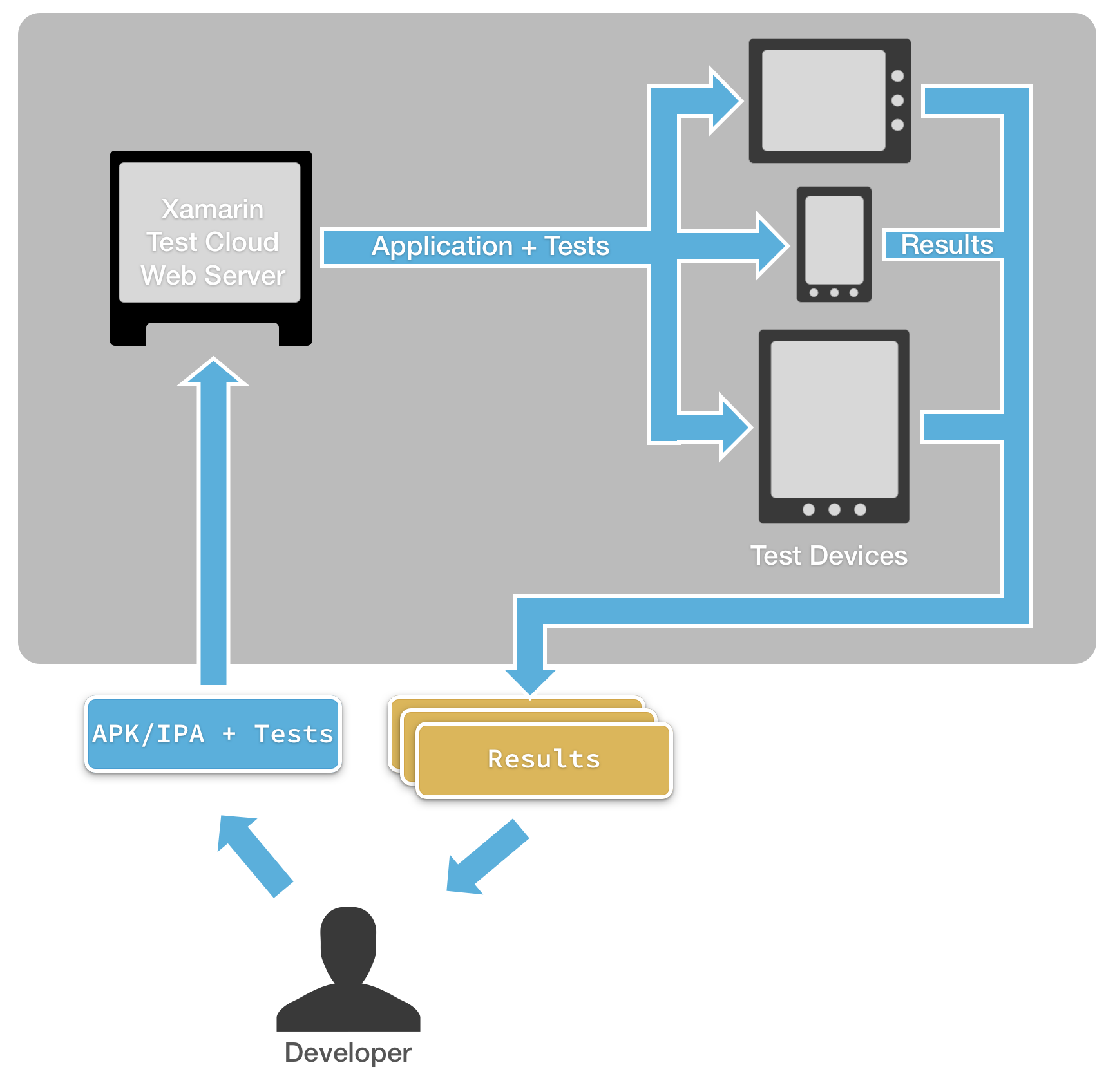 Schematische Darstellung des Test-Ablaufs mit Test Cloud. Quelle: testcloud.xamarin.com